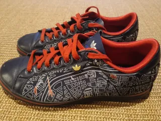 Zapatillas deportivas Adidas con un diseño inspirado en Star Wars. Combinan blanco con detalles en azul y rojo. Perfectas para fans de Star Wars. - Parte superior de malla transpirable. - Suela de goma para mayor tracción. - Cierre de cordones. - Talla 38 2/3 Negociable