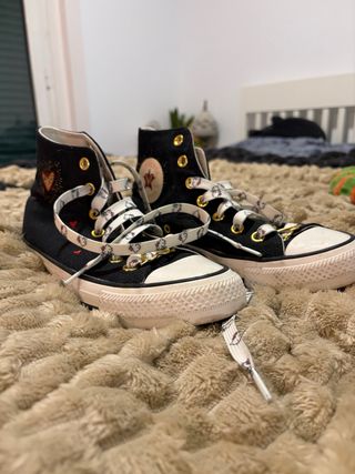 Zapatillas altas Converse en color negro y blanco, talla 38. Presentan un diseño con cordones blancos y detalles de corazones y un corazón grande con rayos en el lateral. - Zapatillas altas. - Cordones blancos con estampado. - Detalle de corazones rojos. - Diseño de corazón con rayos.