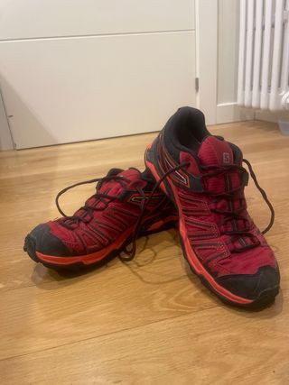 Zapatillas de senderismo Salomon en tonos rojos y negros. Diseñadas para ofrecer comodidad y agarre en terrenos variados. - Parte superior de malla transpirable. - Suela de goma para tracción. - Cierre con cordones.