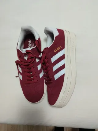 Zapatillas Adidas Gazelle en color rojo, perfectas para un estilo casual. - Exterior de ante. - Detalle de las tres franjas blancas. - Suela de goma. Se venden porque me llegaron grandes y me rozan. Dos puestas