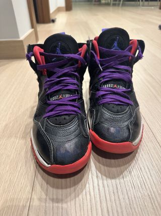 Zapatillas de baloncesto Air Jordan. - Color principal negro con detalles morados y rojos. - Cordones morados. - Diseño de caña alta.