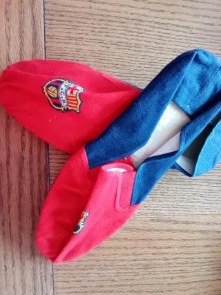 Zapatillas de estar por casa del FC Barcelona vintage. En su bolso de tela original - Diseño en color rojo y azul. - Escudo del club bordado en la parte delantera. - Talla 45.