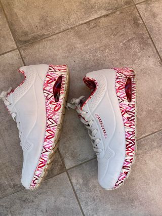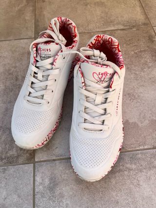 Zapatillas deportivas Skechers con un diseño moderno y llamativo. - Exterior blanco con detalles en rosa. - Interior con estampado de corazones y líneas en rosa y rojo. - Cierre de cordones. - La talla corresponde a 26,5cm de pie.