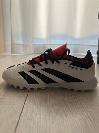 Zapatillas de fútbol Adidas Predator en color blanco con detalles en negro y rojo. Diseñadas para multitacos. - Diseño Predator. - Tacos para césped artificial o natural.