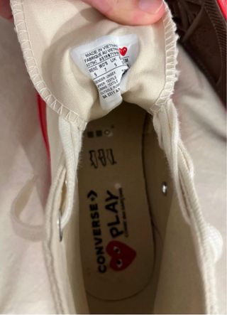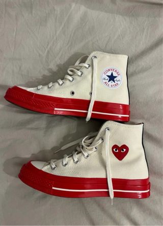 Zapatillas altas Converse x Comme des Garçons. - Diseño icónico con el corazón de CDG. - Combinación de colores blanco y rojo. - Cordones blancos.