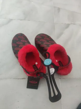 Zapatillas de estar por casa con el diseño de Stranger Things. Son muy cómodas y cálidas. - Forro interior rojo. - Estampado de Stranger Things en rojo sobre fondo negro.