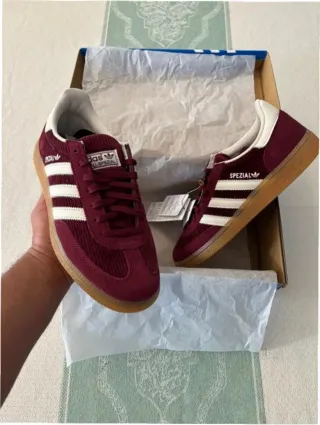 Zapatillas Adidas Handball Spezial en color rojo y talla 39. Un clásico con un diseño atemporal. - Parte superior de ante y corduroy. - Suela de goma. - Detalle de las tres rayas blancas.