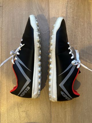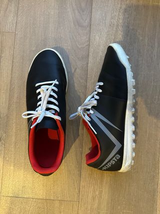 Botas de fútbol marca Kipsta (Decatlón) en talla 41/42 (la etiqueta marca 42, usadas para alguien que calza 41). Usadas en un par de ocasiones pero están limpias y en perfecto estado, cumplen su función perfectamente para un uso básico. Venta por mudanza, más chollos en mi perfil! - Exterior en material sintético, color negro. - Forro interior textil, color rojo. - Suela con tacos para césped artificial o natural.