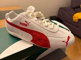 Zapatillas deportivas Puma con un diseño moderno y llamativo. - Combinación de colores blanco y rojo. - Logo de Puma en contraste.