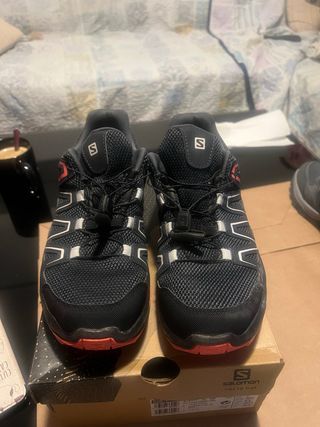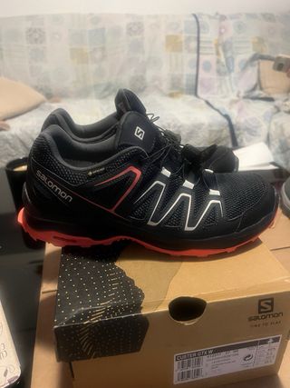 Zapatillas Salomon Custer GTX W en color negro con detalles rojos. Perfectas para actividades al aire libre. - Diseño deportivo. - Cierre rápido. - Suela de goma. Usadas una vez.