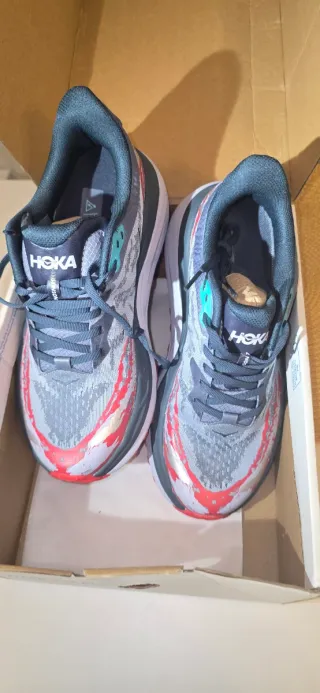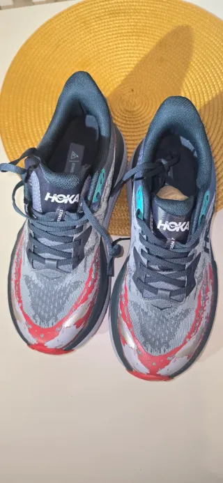 Zapatillas deportivas Hoka para hombre con un diseño moderno. - Combinación de colores gris y rojo. - Cierre con cordones.
