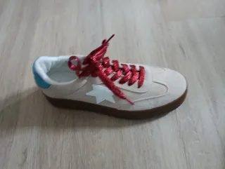 Zapatillas de moda con un diseño moderno. - Exterior en ante beige. - Detalle de estrella blanca. - Forro interior azul. - Cordones rojos brillantes.