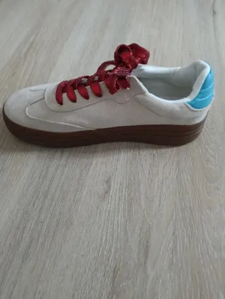 Zapatillas BASQ talla 41 en color beige y rojo. Están prácticamente nuevas. - Son unas zapatillas de estilo casual. - Ideales para el día a día. - La suela es de goma color marrón claro. - El diseño es limpio y elegante.