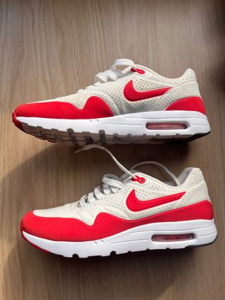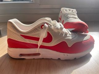 Zapatillas Nike Air Max 1 con un diseño llamativo en crema y rojo universitario. Usadas una vez. - Parte superior de cuero perforado. - Detalle de Swoosh en contraste. - Unidad Air visible en la entresuela.
