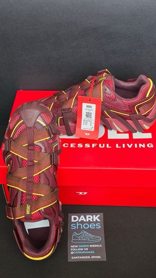 Zapatillas Diesel S-Prototype-Cr Granate y Amarillo 👟 • Talla: 42. • Estado: Nuevas a estrenar (Deadstock). Conservan las etiquetas rojas de autenticidad originales sin cortar. • Diseño: Combinación de colores granate y detalles en amarillo. Cuentan con unas llamativas molduras geométricas de goma en el talón y la suela que le dan un diseño técnico y futurista. • Incluye: Caja original roja de la marca.