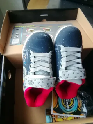 Talla 30 EU Zapatillas con ruedas, ideales para deslizarse y divertirse. El diseño presenta un fondo azul oscuro con pequeñas estrellas blancas, simulando el espacio. - Cierre con cordones grises. - Detalle de banda lateral con el logo de Heelys. - Forro interior de color rojo vibrante.