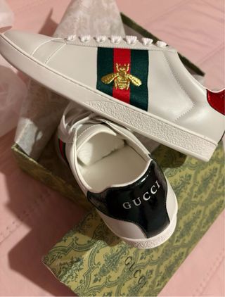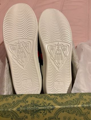 Zapatillas bajas de la marca Gucci, modelo Ace. - Diseño con detalles en rojo. - Suela de goma blanca con relieve. - Logo de Gucci y made in italy en la suela. - Escudo decorativo en la suela.