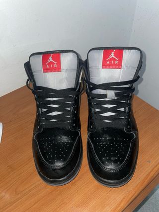 Zapatillas deportivas de la marca Jordan. - Diseño icónico en blanco y negro. - Detalles en charol. - Suela con detalles rojos.