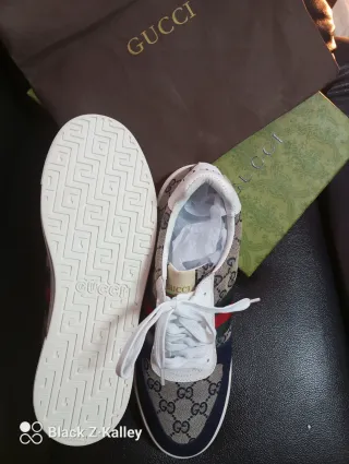 Zapatillas de la marca Gucci en talla 45. Presentan un diseño con el monograma característico de la marca. - Suela con relieve y logo. - Detalle de franja verde y roja.