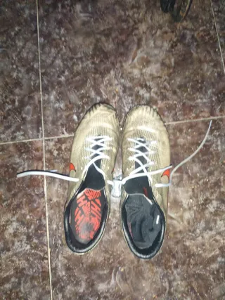 Botas de fútbol Nike con un diseño llamativo. Modelo Neymar. Las zapatillas las habré usado unos 8 partidos más o menos. - Color principal dorado con detalles en rojo. - Cordones blancos. - Suela con tacos.