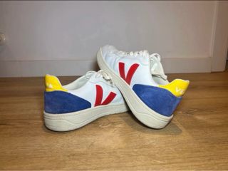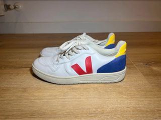 Zapatillas deportivas Veja V-10 con un diseño moderno y llamativo. - Combinación de colores blanco, rojo, azul y amarillo. - Materiales de alta calidad.