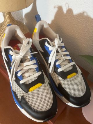 Zapatillas deportivas Puma con un diseño moderno y llamativo. - Combinación de colores: negro, azul, blanco, rojo y amarillo. - Materiales de malla y cuero sintético.