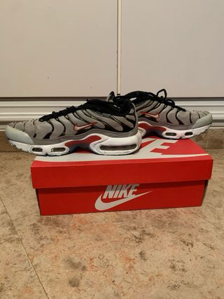 Zapatillas deportivas Nike Air Max TN con un diseño llamativo. - Combinación de colores gris y detalles en rojo. - Suela con amortiguación. - Originales ✅ - Envío rápido 🚚