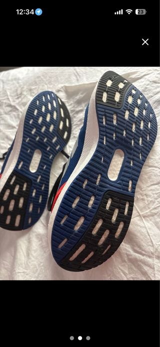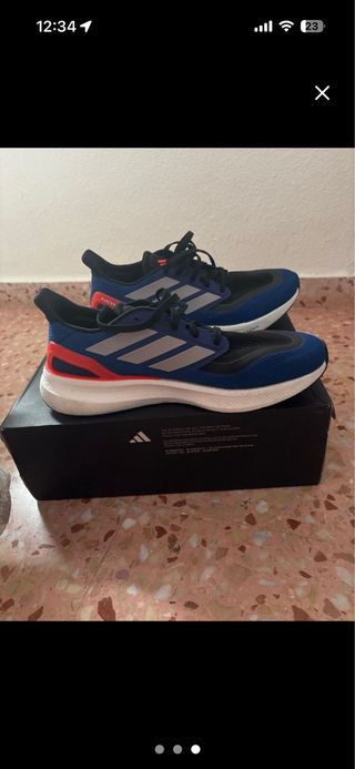 Zapatillas deportivas Adidas con un diseño moderno y llamativo. - Combinación de colores azul y rojo. - Detalles en gris en los laterales. Pureboost 5. Usada muy poco - Diseño en color azul con detalles en naranja. - Tiras laterales plateadas. - Suela azul borde bajo lateral negro TALLA 45 1/2 largo pie 29 como se aprecia foto Hecho