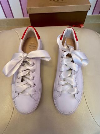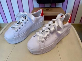 Zapatillas de plataforma en color blanco con detalles rojos. - Cordones de lazo de satén blanco. - Suela gruesa de plataforma 5 cm. - Envio en caja de cartón.