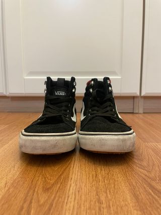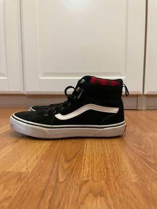 Zapatillas altas de Vans para niño en color negro con detalles rojos. - Cierre con cordones. - Ojales metálicos para los cordones. -Talla 37 - Suela de goma blanca.