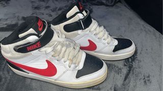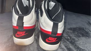 Zapatillas deportivas de la marca Jordan en colores rojo y blanco. - Diseño de caña alta. - Cierre con cordones negros. - Detalle del logo Jumpman en la lengüeta. faltan los dos velcros pequeños pero no afecta nada.Esta nuevita como se ve en las foto.Se venden como están y son originales.