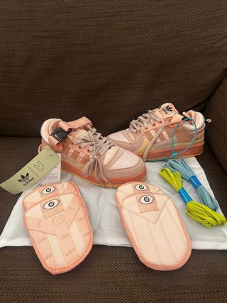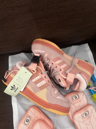 Zapatillas Adidas Forum Low en colaboración con Bad Bunny, en tonos rosas y naranjas. - Incluye cordones adicionales. - Diseño con detalles distintivos de la colaboración. - Cierre con velcro y cordones.