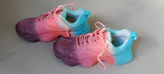 Zapatillas deportivas Kelme con un diseño degradado que combina tonos rosas y morados, con detalles en azul claro en la lengüeta. Sólo usado una vez - Cierre con cordones. - Suela gruesa y cómoda. - Diseño moderno y llamativo.