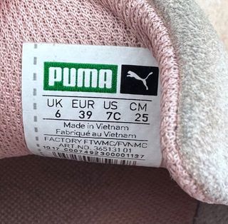 Zapatillas Puma de ante en color rosa, con detalles de pedrería en el talón. - Diseño moderno y llamativo. - Suela de goma marrón. - Logo de Puma grabado en la suela.