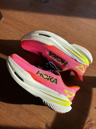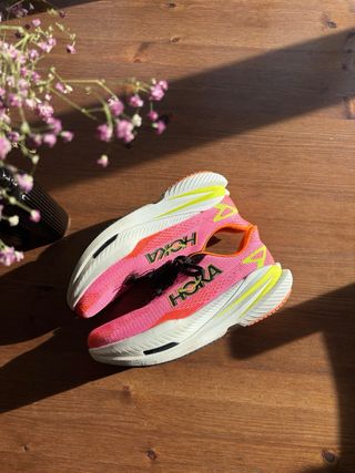 Zapatillas Hoka Mach X3 para mujer en llamativos tonos rosa y amarillo. Diseñadas para ofrecer comodidad y rendimiento. - Parte superior de malla transpirable. - Entresuela con espuma CMEVA. - Suela de goma para mayor durabilidad.