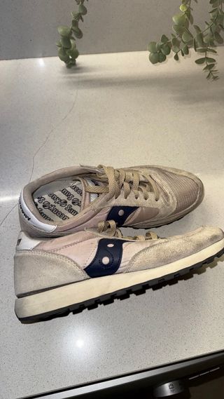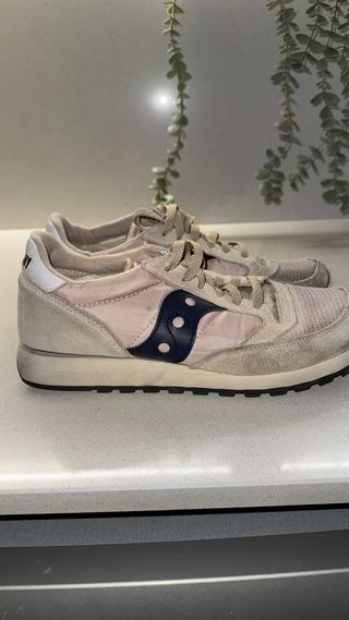 Zapatillas deportivas Saucony en tonos beige y rosa. Un diseño clásico y cómodo. ORIGINALES - Parte superior de ante y nailon. - Detalle del logo Saucony en contraste. Talla 42,5 Poco uso. Si te llevas las dos te hago precio
