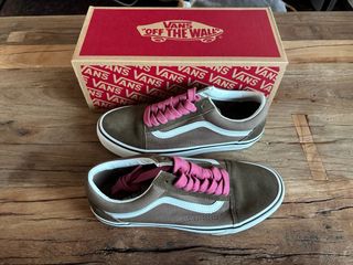 Zapatillas Vans Old Skool con un diseño clásico y moderno. - Color principal marrón. - Cordones de color rosa vibrante. - Raya lateral blanca característica de Vans.