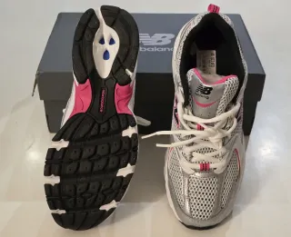 Zapatillas deportivas New Balance modelo MR530FS. - Diseño en color plata y detalles en rosa. - Talla 39.5 EUR (6 UK, 6.5 US D). - Parte superior de malla transpirable.