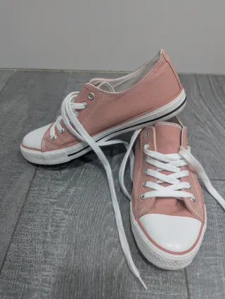 Zapatillas tipo Converse en color rosa, con detalles en blanco y etiquetas de marca en la lengüeta y el talón. Talla 39, perfectas para looks casuales y urbanos. Nunca usadas, en perfecto estado, salvo por el paso del tiempo en los cordones. ¡Ideales para dar un toque alegre a cualquier outfit!
