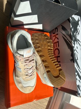Zapatillas New Balance 574 originales en tonos beige, rosa y blanco, con el logo “N” gris claro. Están en muy buen estado, solo con ligeras señales de uso normales (sin roturas ni manchas grandes). Suelas limpias y sin desgaste notable. Muy cómodas, combinan con todo y son perfectas para diario o para outfits casual. Talla: 40 Estado: Usadas pero en perfecto estado Entrega / Envío: Lo que usted elija ¡Cualquier duda, no dudes en consultarme!