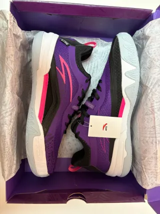Zapatillas deportivas Anta Kai 1 Team "Purple" del jugador de la NBA Kyrie Irving,talla 45 (28 cm),nuevas con su caja y embalajes originales. Si necesitas más información escríbeme. - Diseño vibrante con detalles en rosa. - Cordones negros. - Suela blanca y gris.