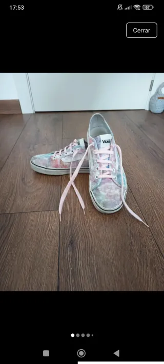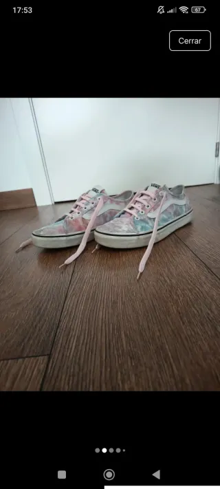 Zapatillas de la marca Vans con un diseño tie-dye muy llamativo. - Estampado multicolor con tonos rosas y azules. - Cierre con cordones. - Suela de goma. Se encuentran en muy buen estado, simplemente tienen el logo de detrás despintado y la suela sucia. Son de colores claros (celeste, lila, rosa) y con corazones blancos efecto tye-dye. Estoy abierta a negociaciones lógicas.