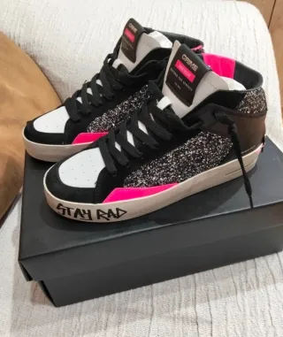 Zapatillas altas de Crime London con un diseño llamativo. - Detalle de purpurina plateada. - Puntera blanca y detalles en rosa fucsia. - Suela blanca con inscripción STAY RAD. - Logo SK8/DELUXE en el lateral.
