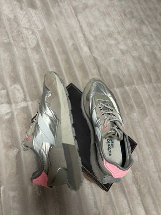 ✨ Vendo lote de dos pares de zapatillas en talla 36. Incluye: 👟 Zapatillas deportivas blancas con detalles iridiscentes y cordones en blanco y negro. Muy cómodas. 👟Zapatillas color Bailarinas rosa nude con puntera brillante y tiras elásticas cruzadas. Elegantes y perfectas para ocasiones especiales y conforto al día a día. Ambas poco usadas y en buen estado, tal y como se ve en las fotos. ✨ Precio por el lote completo: 12€. 🚫