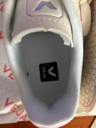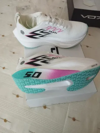 Zapatillas deportivas de la marca VO7 en talla 40. Diseño moderno y llamativo. - Combinación de colores blanco, turquesa y rosa. - Detalle de logo y diseño lateral. - Suela con degradado de color.