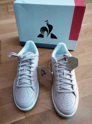 Zapatillas de la marca Le Coq Sportif en talla 37-38. Un diseño moderno y cómodo. Son un número 38, pero tallan justas - Color rosa y blanco. - Material de cuero. - Cierre con cordones.