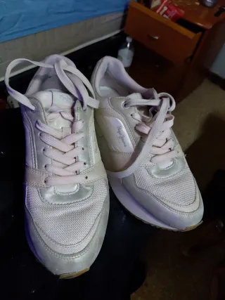 Zapatillas de la marca Carmela en color beige y rosa palo. Cuentan con un diseño moderno y cómodo. - Cierre de cremallera. - Detalle de material brillante en los laterales. - Suela de goma. - Logo de la marca en la lengüeta y lateral. Cómodas, se adaptan sin oprimir.Permite movimiento, seguras. Algo usadas.