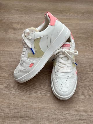Zapatillas deportivas Victoria para niña en talla 38. Combinan blanco con detalles en color rosa y beige. - Cierre con cordones blancos. - Detalle de logo en el lateral. - Suela de goma blanca. Muy poco uso, como nuevas.