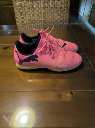 Zapatillas de fútbol sala Puma en color rosa con detalles negros. - Diseño deportivo. - Cierre con cordones.