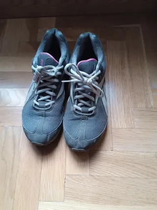Zapatillas deportivas Reebok en tonos grises con detalles en rosa. Están un poco rozadas en los laterales de dentro como se ve en las fotos, pero por el resto están perfectas - Diseño deportivo. - Cierre con cordones.